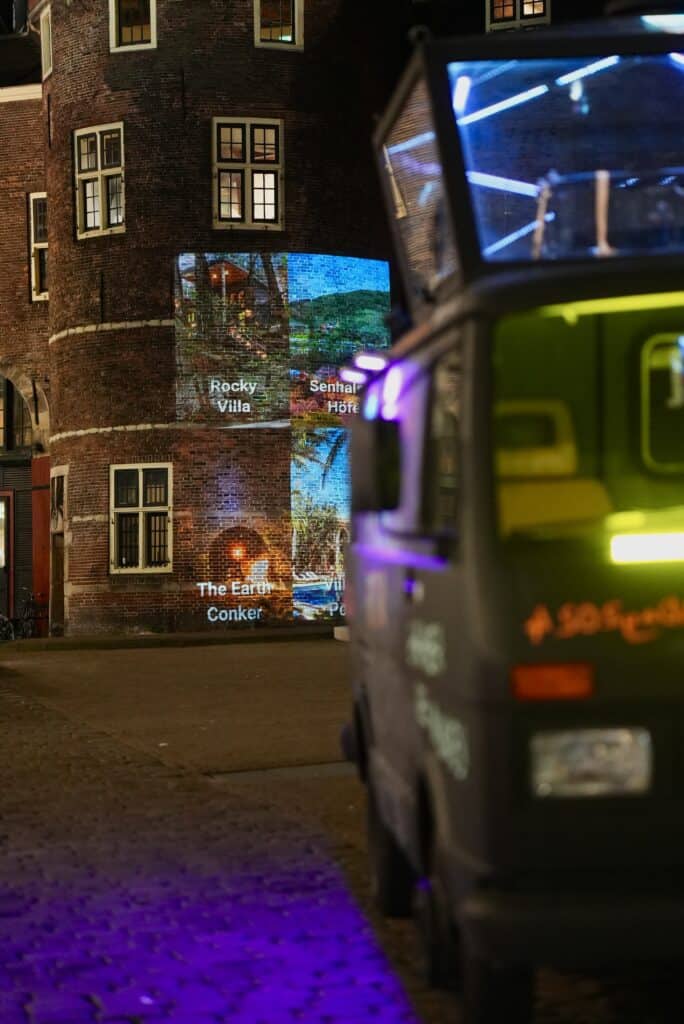 In six out of the eight cities, we partnered with DRIVEABOUT Projection, a first-of-its-kind projection-mapping van equipped with a 100,000-lumen projector, capable of putting our film up in lights all over Europe.
