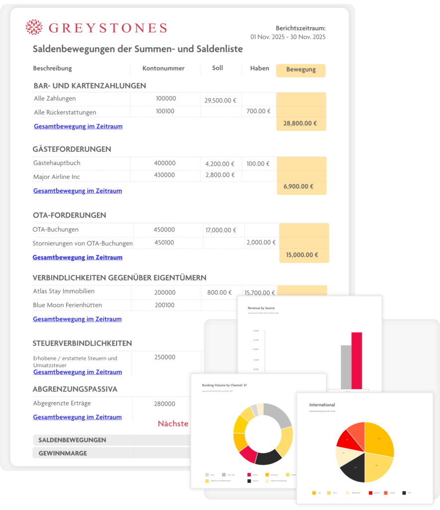 Für tiefere Einblicke stehen Ihnen flexible Reporting-Tools zur Verfügung, mit denen Sie Ihre Daten individuell analysieren können. Automatisierte Abstimmungen und Auswertungen erleichtern zudem den Monatsabschluss und sorgen für Genauigkeit.
