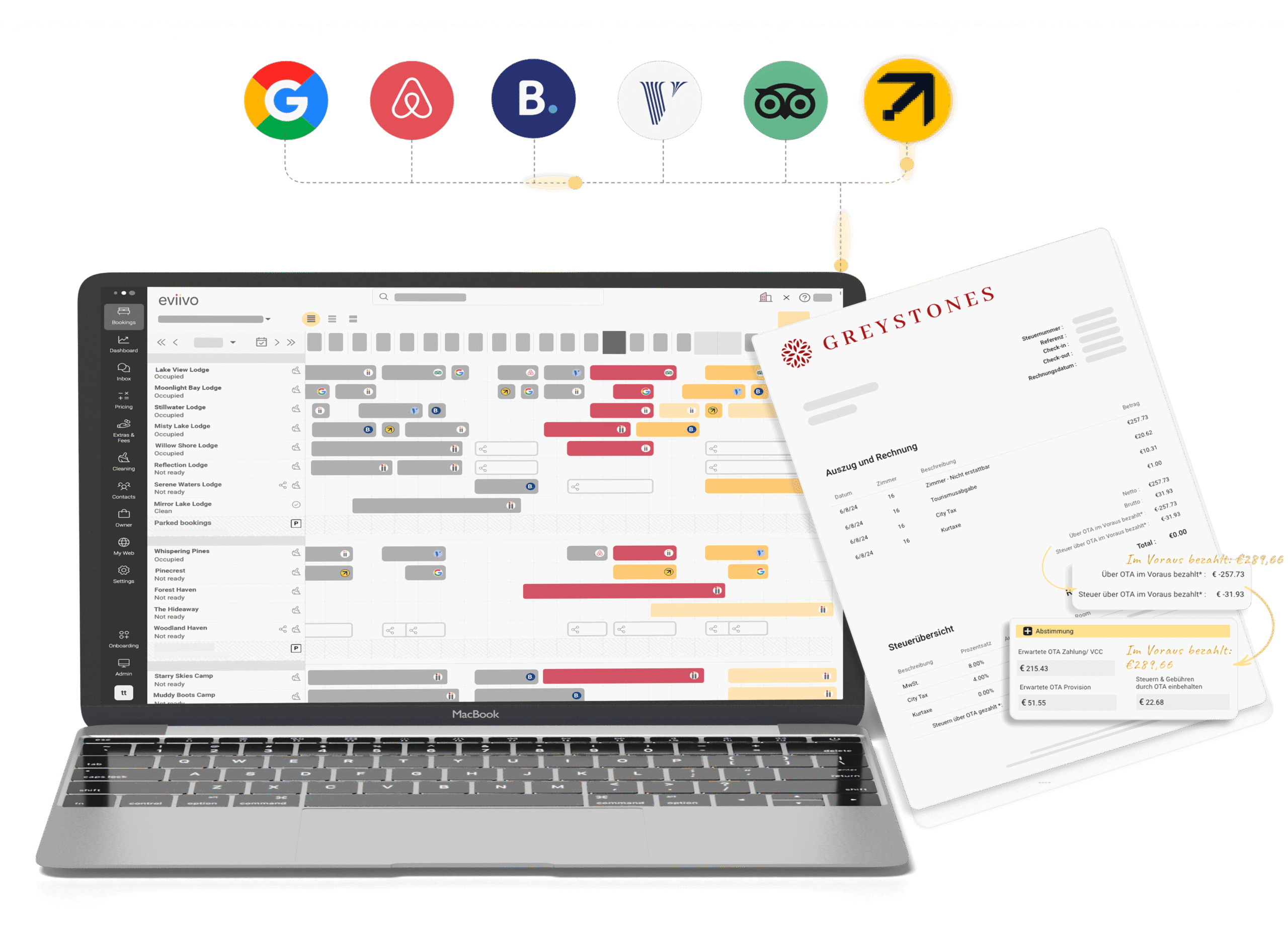 Mit nur einem Klick verbinden Sie eviivo und spielen all Ihre Inserate auf die wichtigsten OTAs aus – darunter Booking.com, Agoda, Airbnb, Expedia (inkl. Partnerseiten), Hotels.com, Mr & Mrs Smith, Vrbo, Google, TripAdvisor, zahlreiche lokale Tourismusportale und viele mehr.