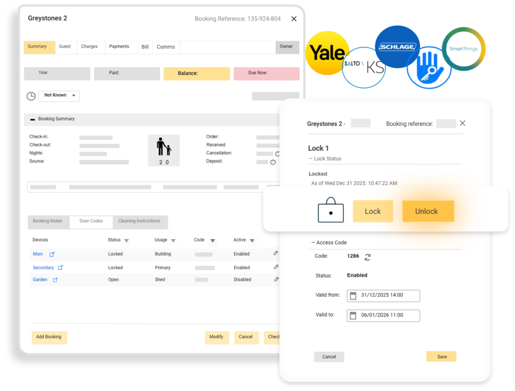 Verwalten Sie unterschiedliche Arten und Ebenen von Smart Locks zentral – entweder über ein einziges, zentrales Geräte-Dashboard oder direkt innerhalb einer Buchung.