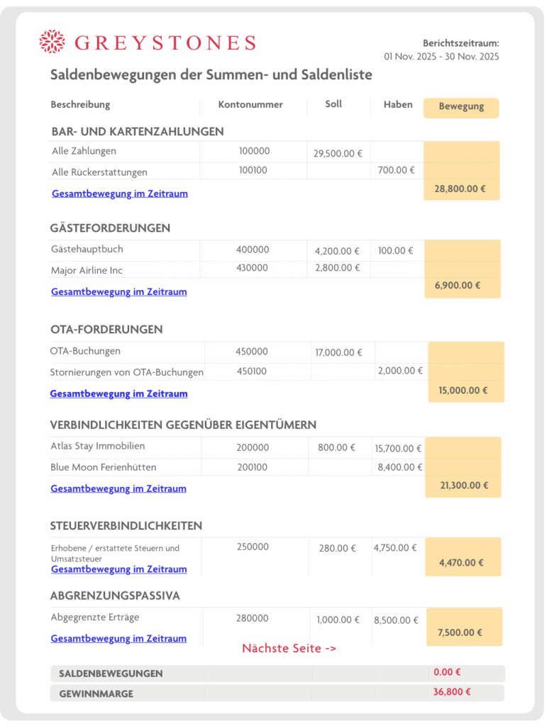 Führen Sie eine getrennte Buchhaltung für Ihr eigenes Portfolio und verwalten Sie separate Hauptbücher für Eigentümer – mit vollständiger Detailansicht bis hin zu einzelnen Posten einer Reservierung.