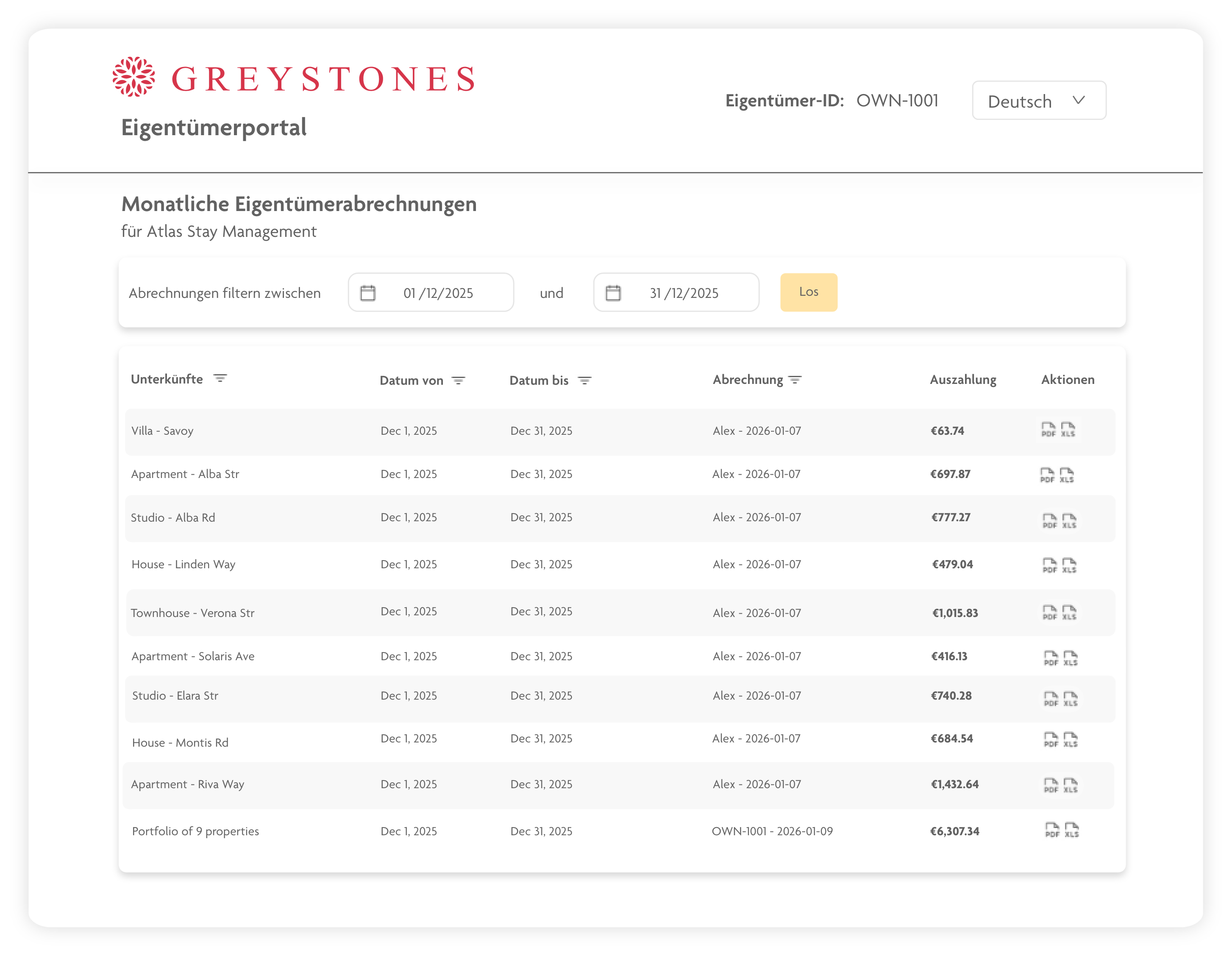 Der Owner Manager ersetzt Tabellenkalkulationen und manuelle Monatsabschlussarbeiten durch Automatisierung und Genauigkeit. Die Eigentümer erhalten klare, transparente Einblicke in die Leistung, Gebühren werden automatisch berechnet und die Arbeit nimmt nur noch einen Bruchteil der Zeit in Anspruch.