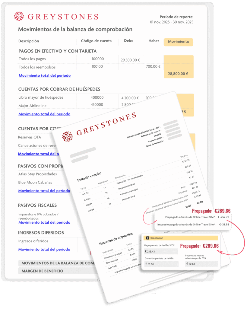 | Concilia pagos por fuente de reserva, tipo de tarjeta o canal OTA. | Detecta anomalías más rápidamente. |