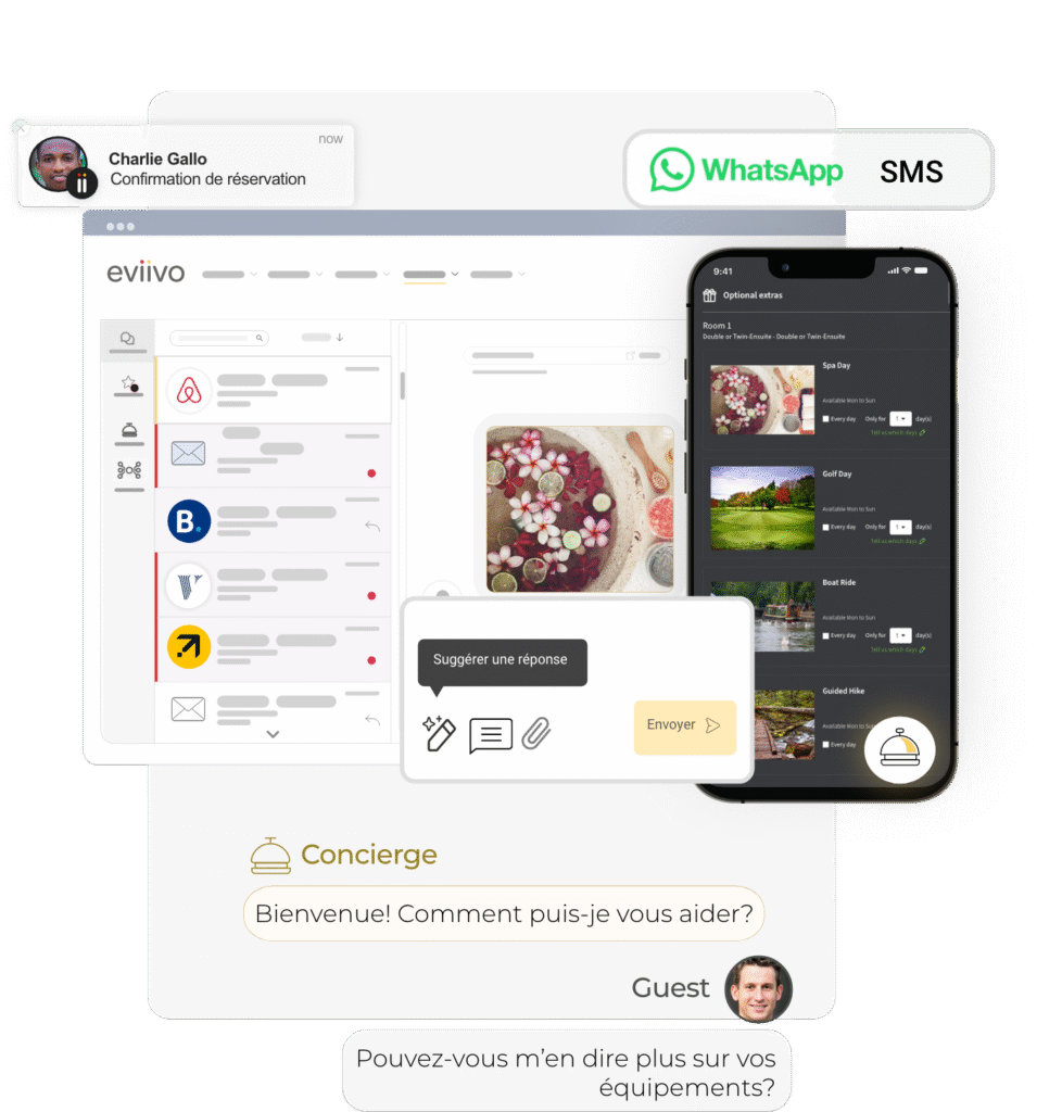 Accédez facilement aux messages de vos clients provenant de Booking.com, Airbnb, Expedia, Vrbo, WhatsApp, SMS ou ayant réservé en direct, et répondez-y facilement depuis votre ordinateur ou mobile.