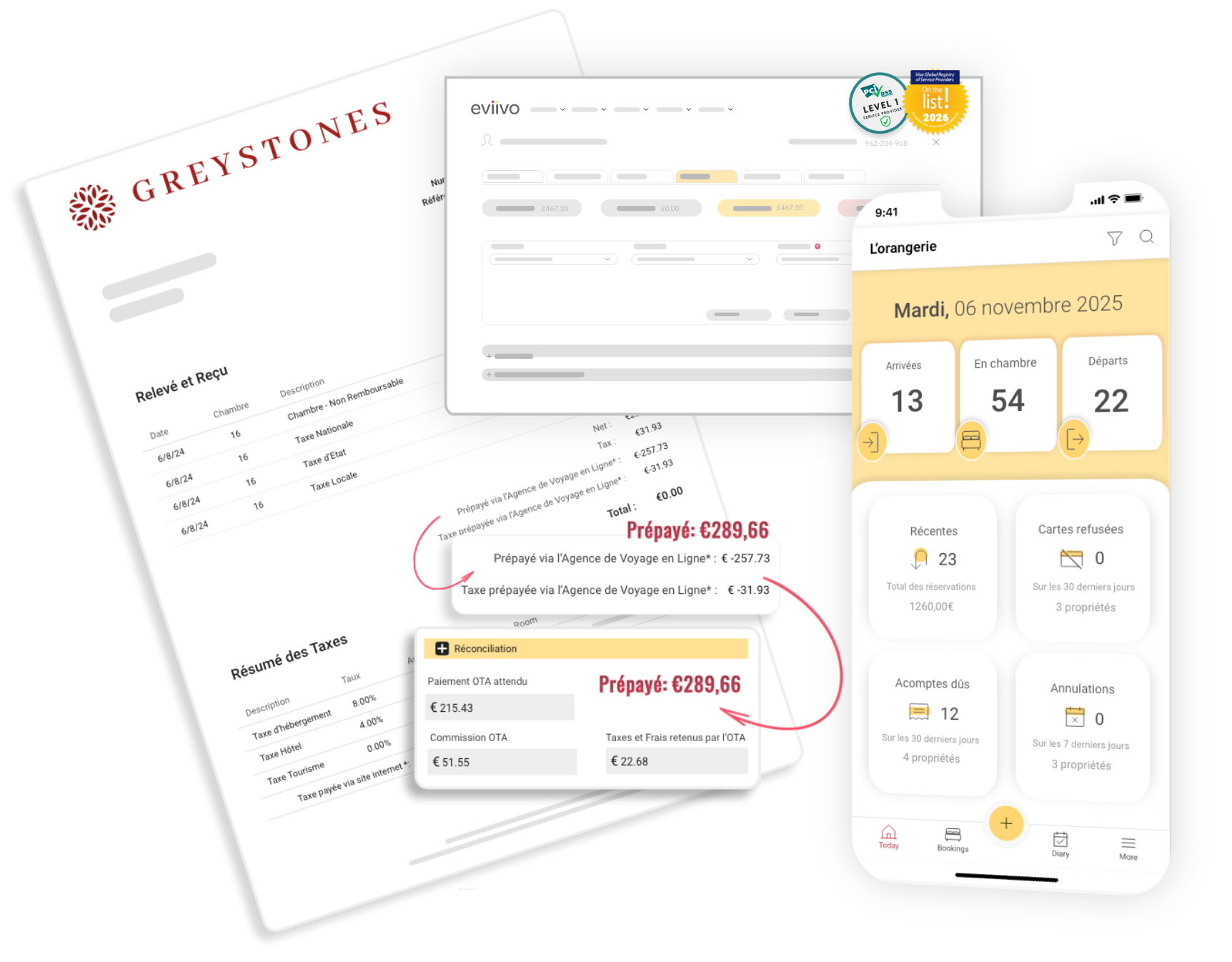Oui. eviivo Suite est conçu pour protéger vos revenus autant que vos clients. Les paiements sont traités selon les normes PCI-DSS niveau 1 et 3DS-2, garantissant une authentification forte des porteurs de carte et une réduction significative du risque de fraude et de rétrofacturation. En cas d’échec de paiement, la carte est signalée instantanément dans le système et le client peut être automatiquement invité à fournir un autre moyen de paiement avant l’arrivée, et non après un no-show