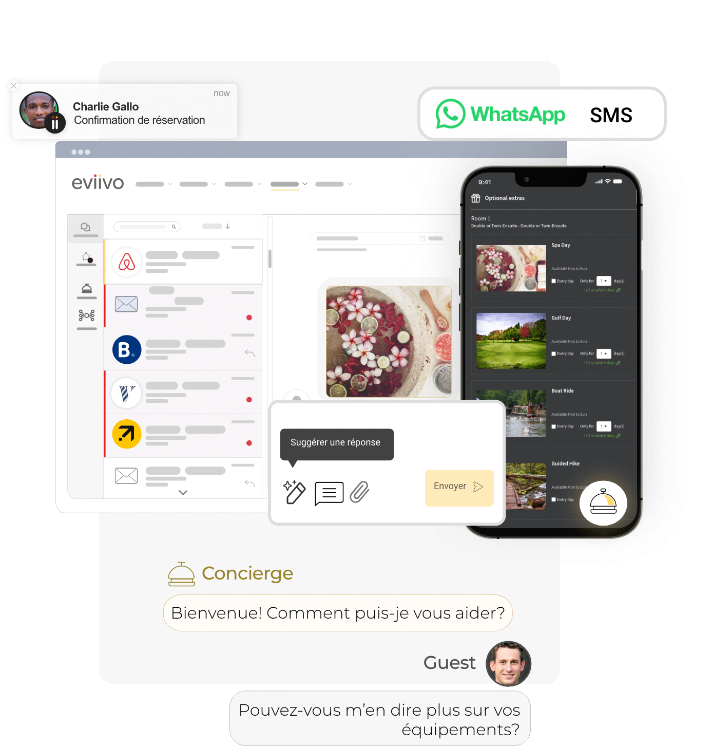 Communiquez instantanément avec eux par SMS et WhatsApp, ou via les plateformes OTA, le tout intégré de manière transparente dans la boîte de réception unifiée primée d’eviivo.