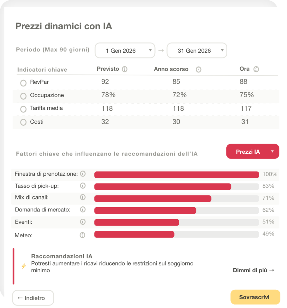 Automatizza gli aggiornamenti delle tariffe sulla base di centinaia di segnali di domanda e fonti di dati del PMS, trasformando i profitti per struttura con una minima parte del lavoro manuale.