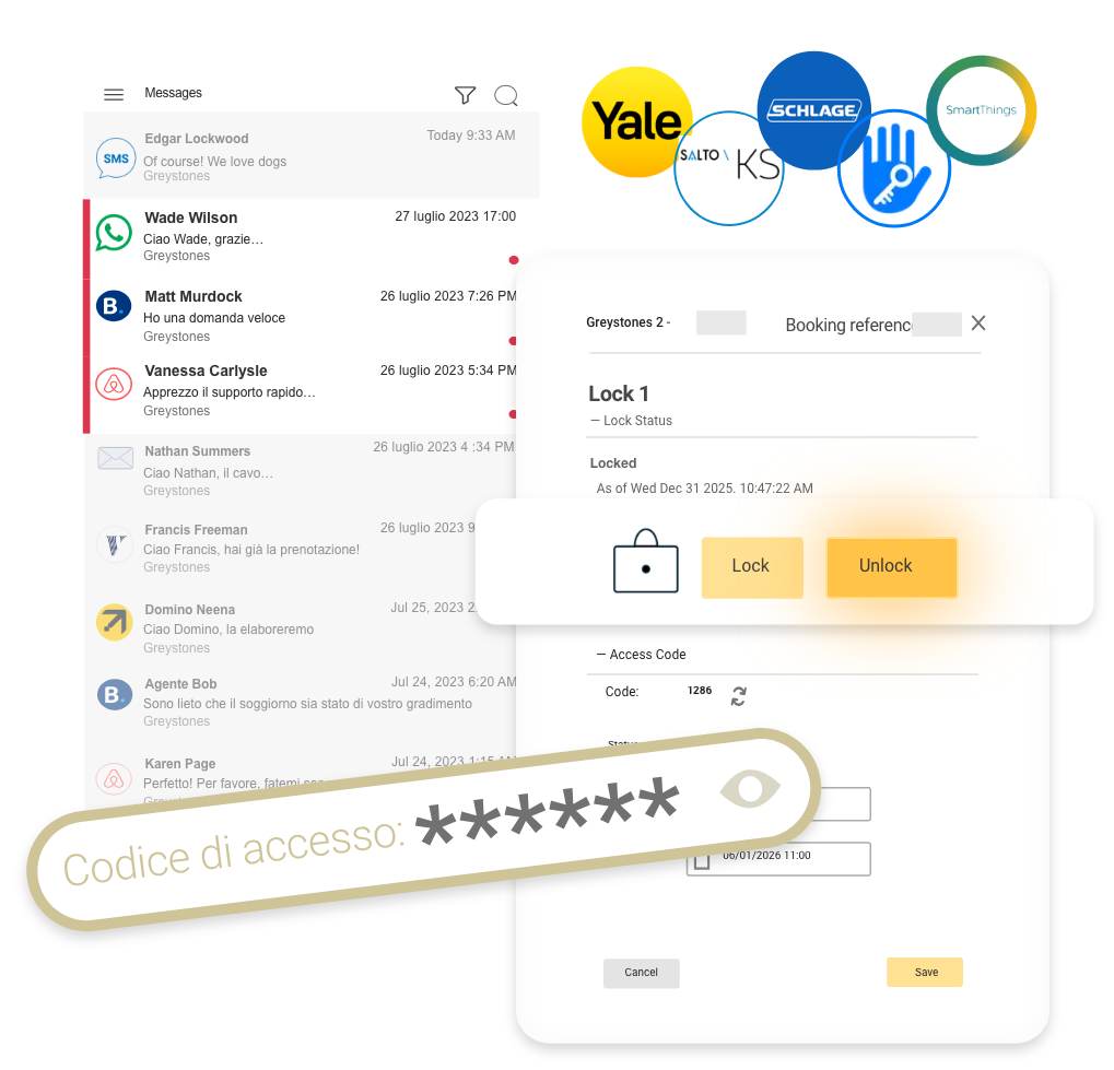 Visualizza le prenotazioni per struttura o per gruppo di strutture, consulta i messaggi degli ospiti da qualsiasi fonte (email, OTA e WhatsApp/SMS), gestisci richieste di prenotazione, incassa pagamenti (o invia un link di pagamento), coordina pulizie e riparazioni e molto altro…