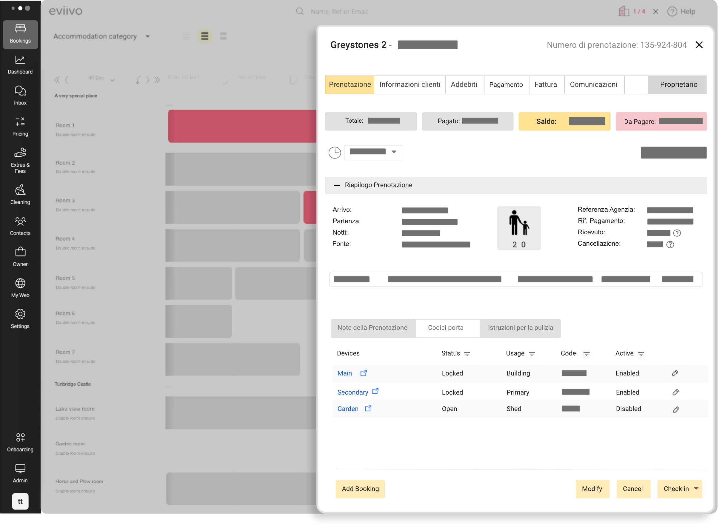 Apri e chiudi porte e cancelli, riemetti i codici di accesso quando necessario o attiva/disattiva le serrature smart da remoto, in qualsiasi momento, direttamente dalla prenotazione nel tuo calendario eviivo.