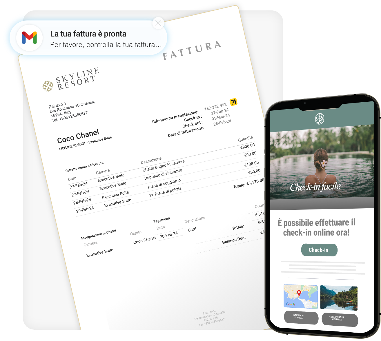 Rendi check-in e check-out semplici e senza attriti grazie a moduli di registrazione, estratti conto e fatture con un solo clic, pronti per essere scaricati, stampati o inviati via email.