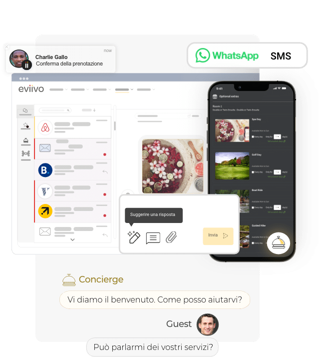 Raggiungili istantaneamente tramite messaggi SMS e WhatsApp, oppure attraverso le piattaforme OTA, il tutto perfettamente integrato nella casella di posta unificata pluripremiata di eviivo.