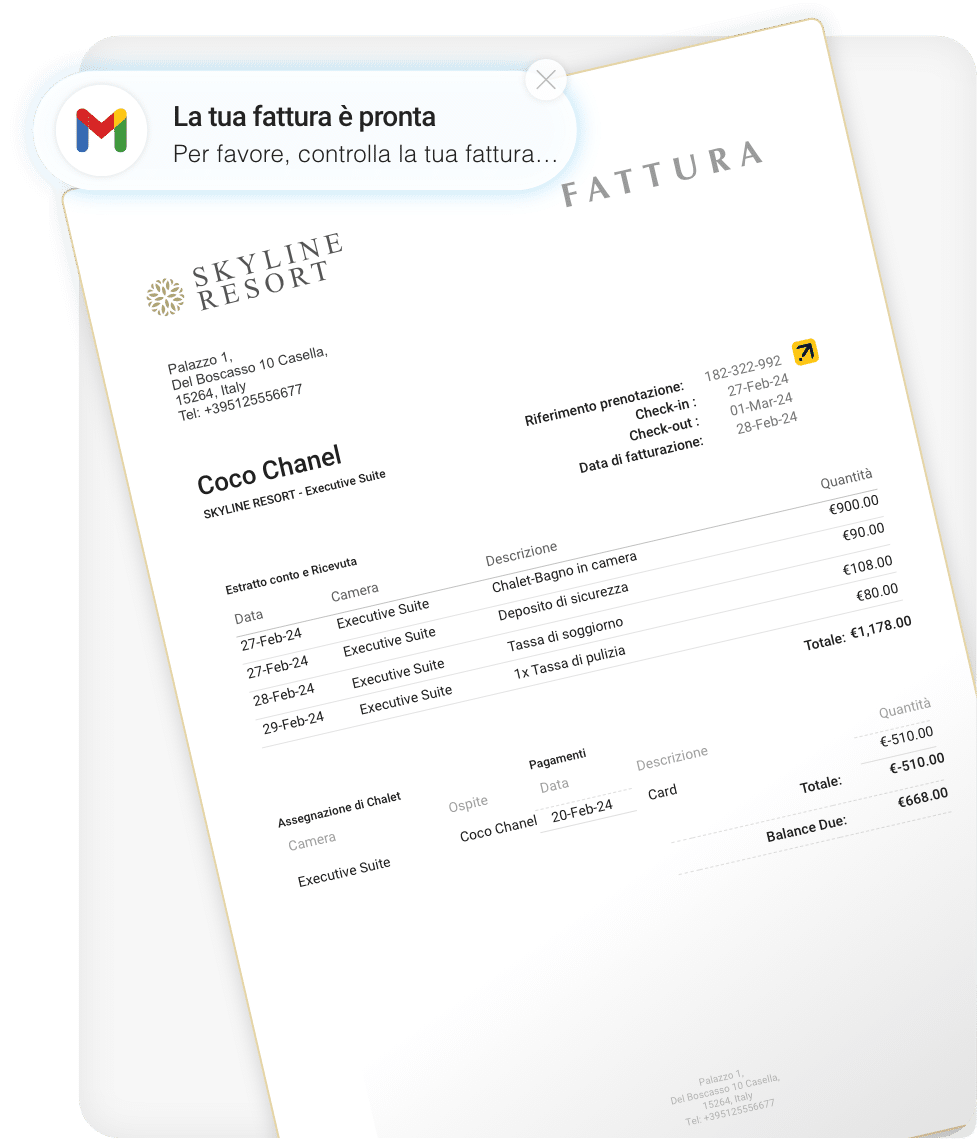 Genera estratti conto per gli ospiti o fatture proforma accurate con un solo clic. Sono pronti per essere scaricati, inviati via email e stampati per i tuoi archivi e per la tranquillità dei tuoi ospiti.