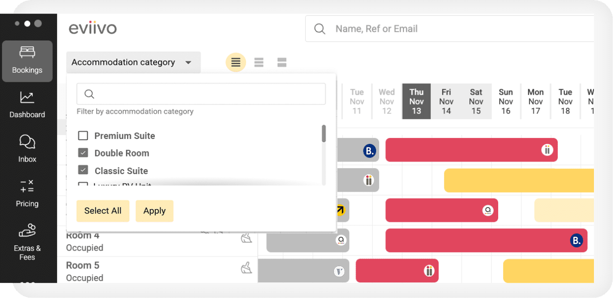 Easily identify OTA bookings by source with color-coded visuals. Explore eviivo’s deep, 2-way synchronization with OTAs.