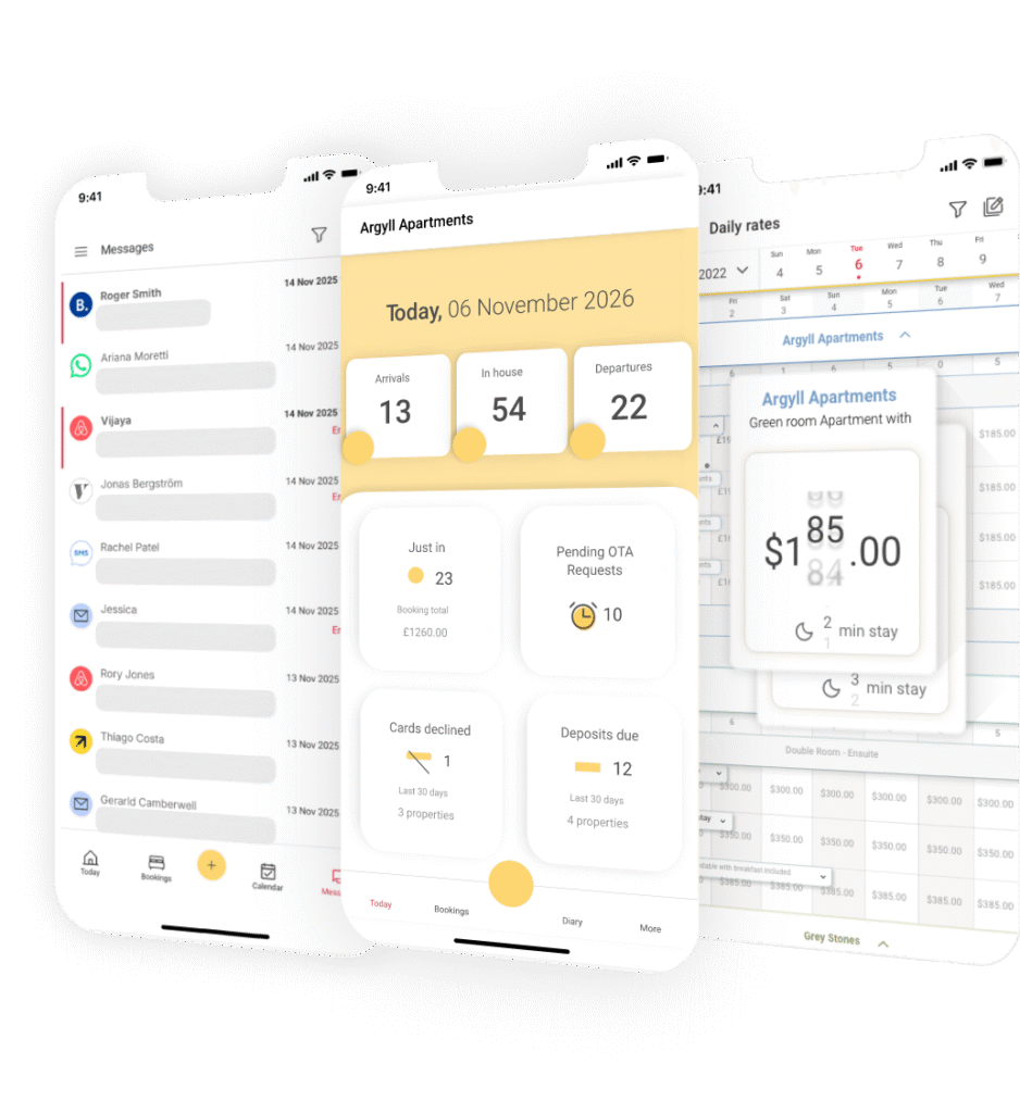 Check availability, arrivals, departures, incoming bookings, and special requests at any moment.