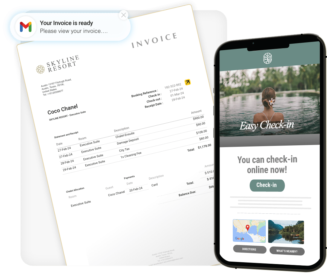Make check-in and check-out frictionless with one-click registration forms, statements and invoices – all ready to download, print or email.