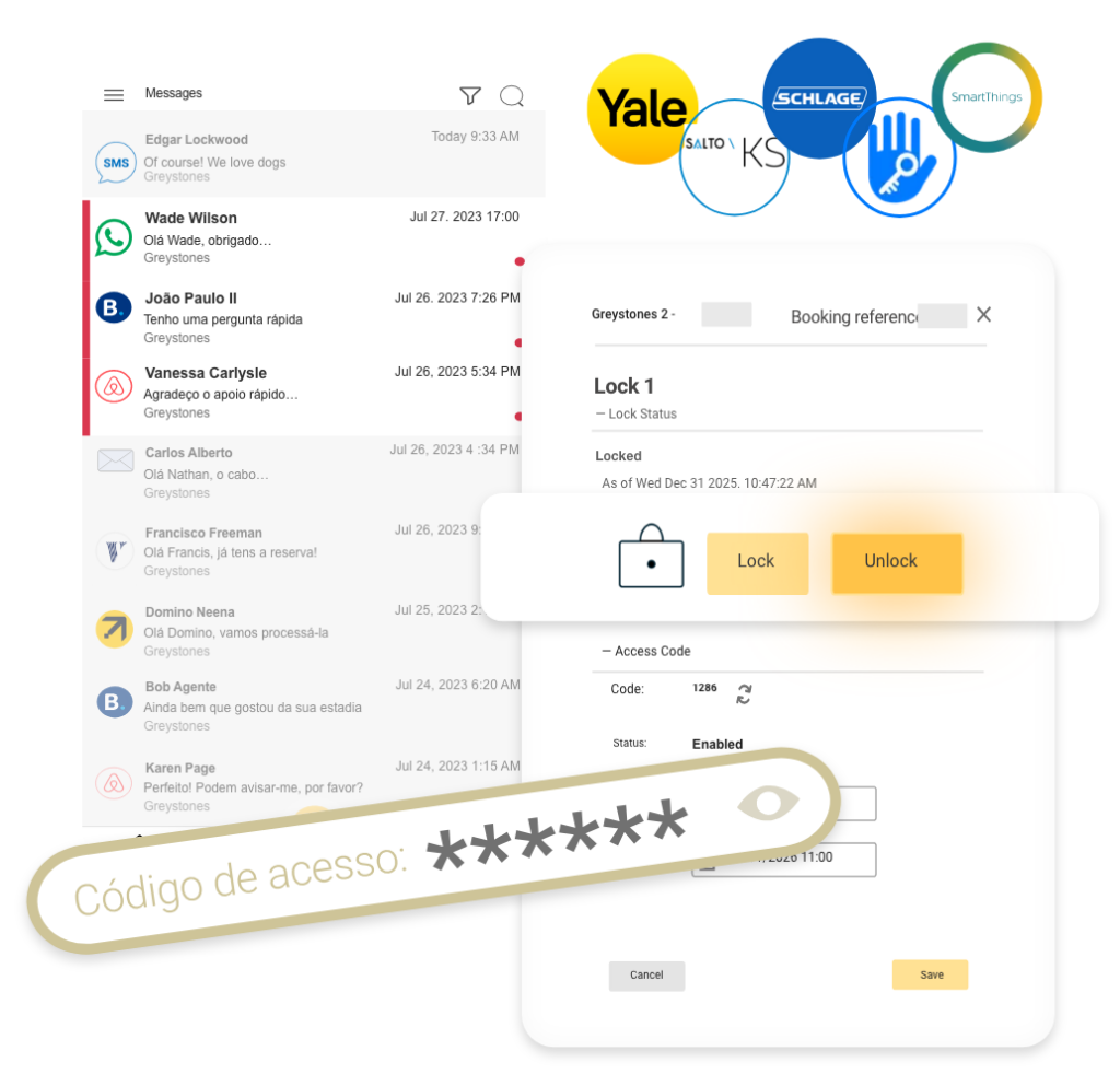 Veja reservas por propriedade ou conjunto de propriedades, consulte mensagens de hóspedes de qualquer origem (email, OTAs e WhatsApp/SMS), trate de pedidos de reserva, receba pagamentos (ou envie um link de pagamento), coordene limpezas e reparações e muito mais…