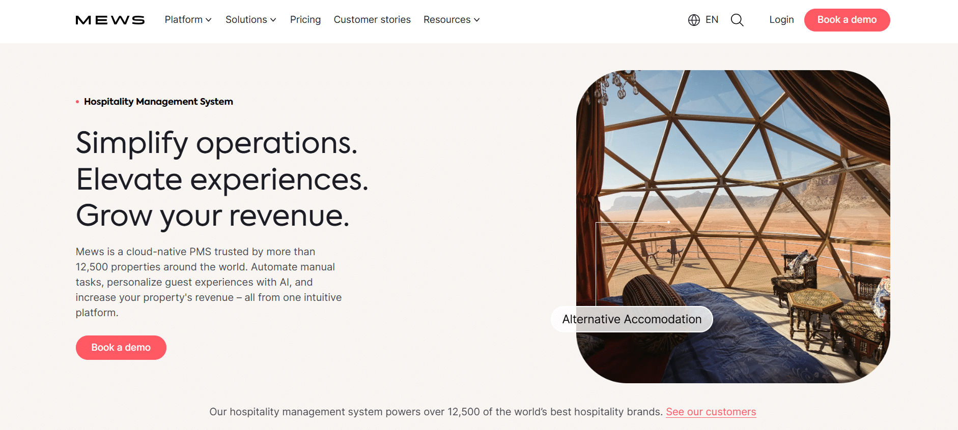 Mews is a cloud-native hotel management system designed to help hotels customize their tech stacks, automate tasks and enhance the guest experience. 12,500+ hotels use Mews’ HMS globally, appreciated for its open integrations and modern design.
