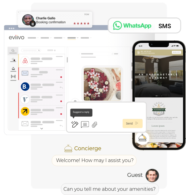 eviivo Suite also streamlines guest communications through its integrated AI tools, including a virtual Concierge that can address travelers’ website queries 24/7 and AI-suggested optimized replies (translatable into multiple languages) that improve guest experience. According to customer data, eviivo’s AI-powered communication tools automate up to 90% of responses to guests based on data such as hotel website information.